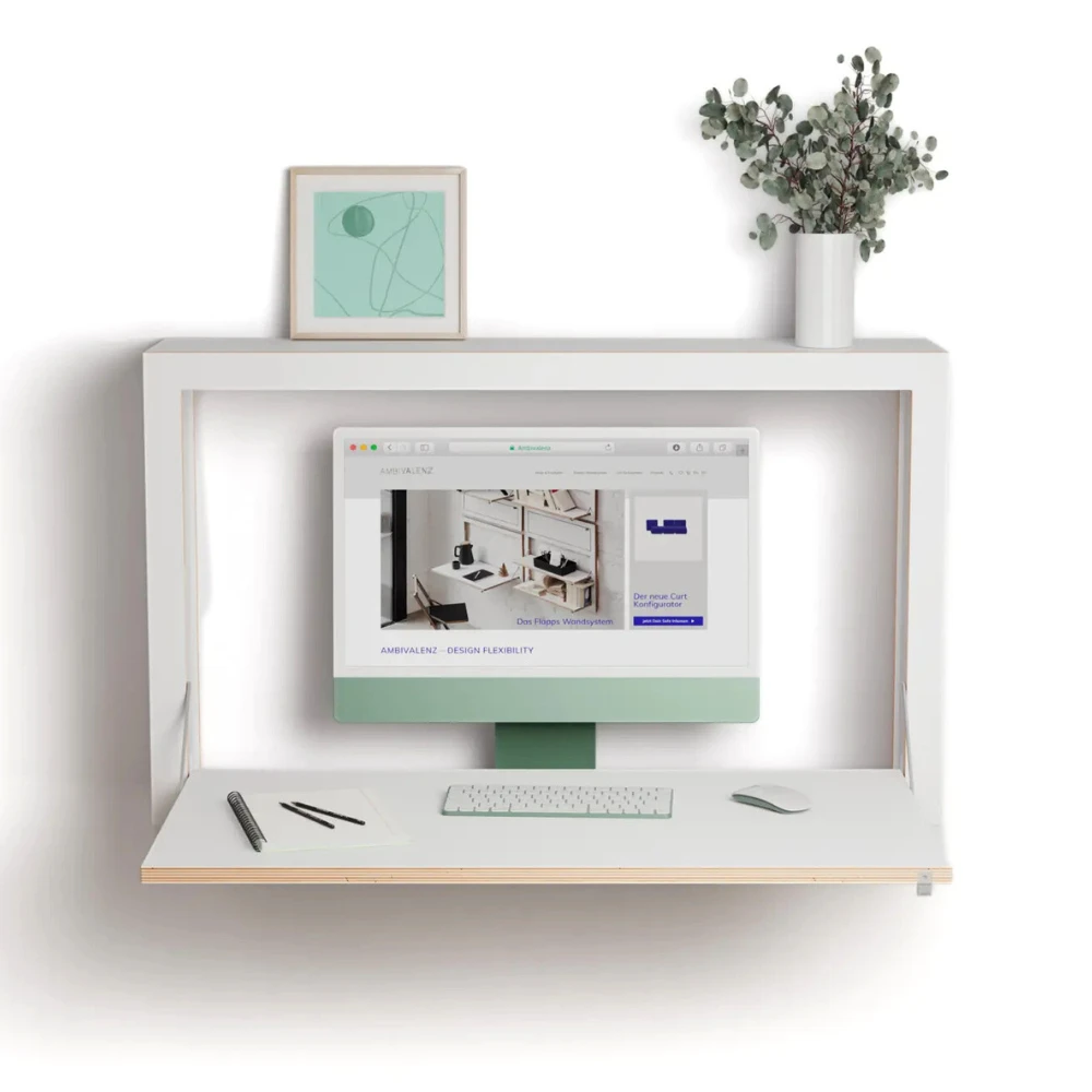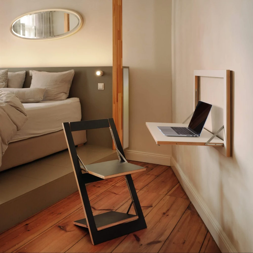 La gamme Compact se compose de bureaux muraux rabattables et d’un système d’étagères qui créent un poste de travail confortable en quelques secondes, puis se replient au mur pour libérer instantanément l’espace. Pensés pour les pièces multifonctions, il permettent d’alterner travail, détente et réception sans encombrer le sol ni alourdir la déco.