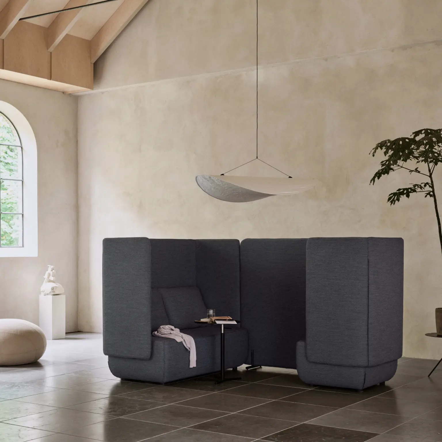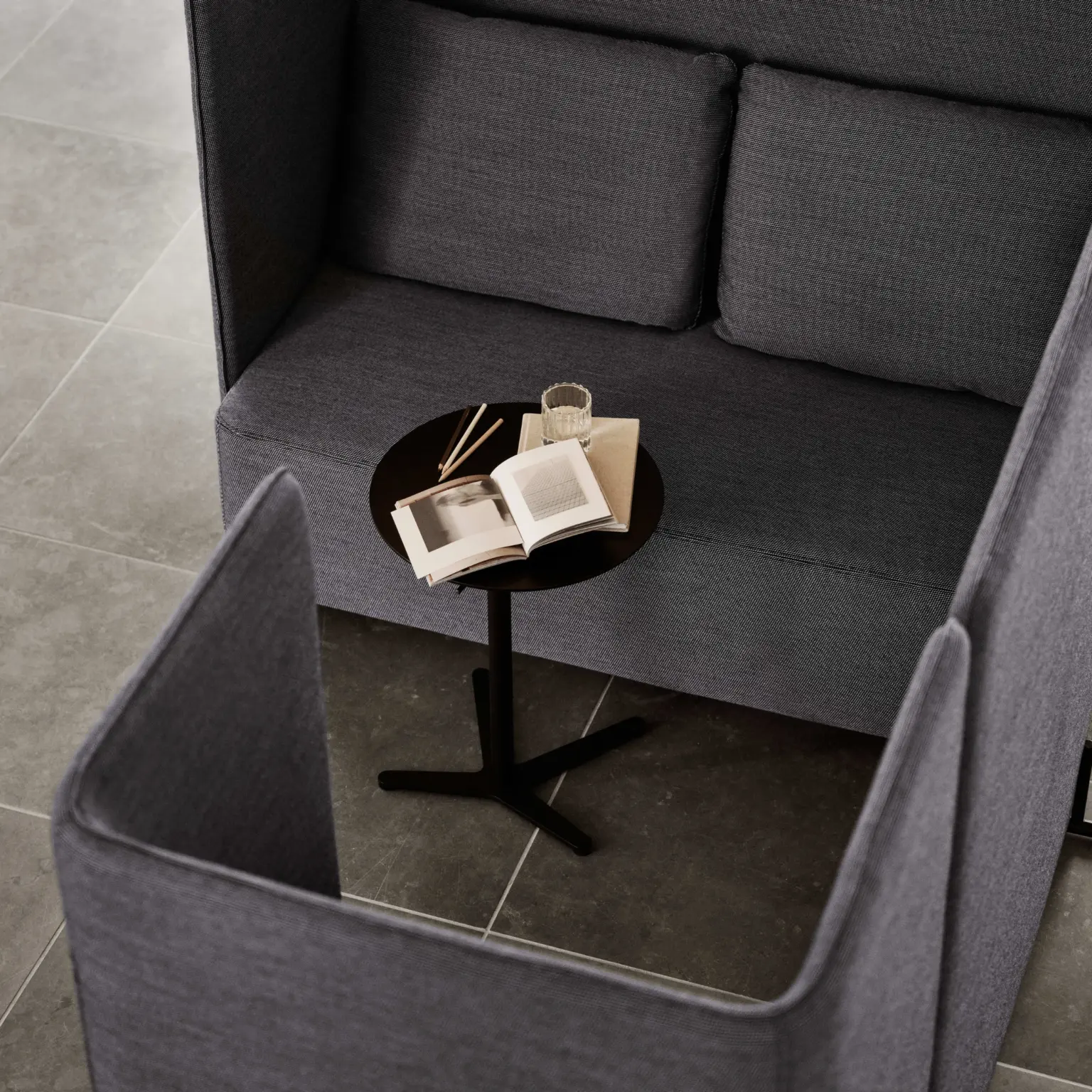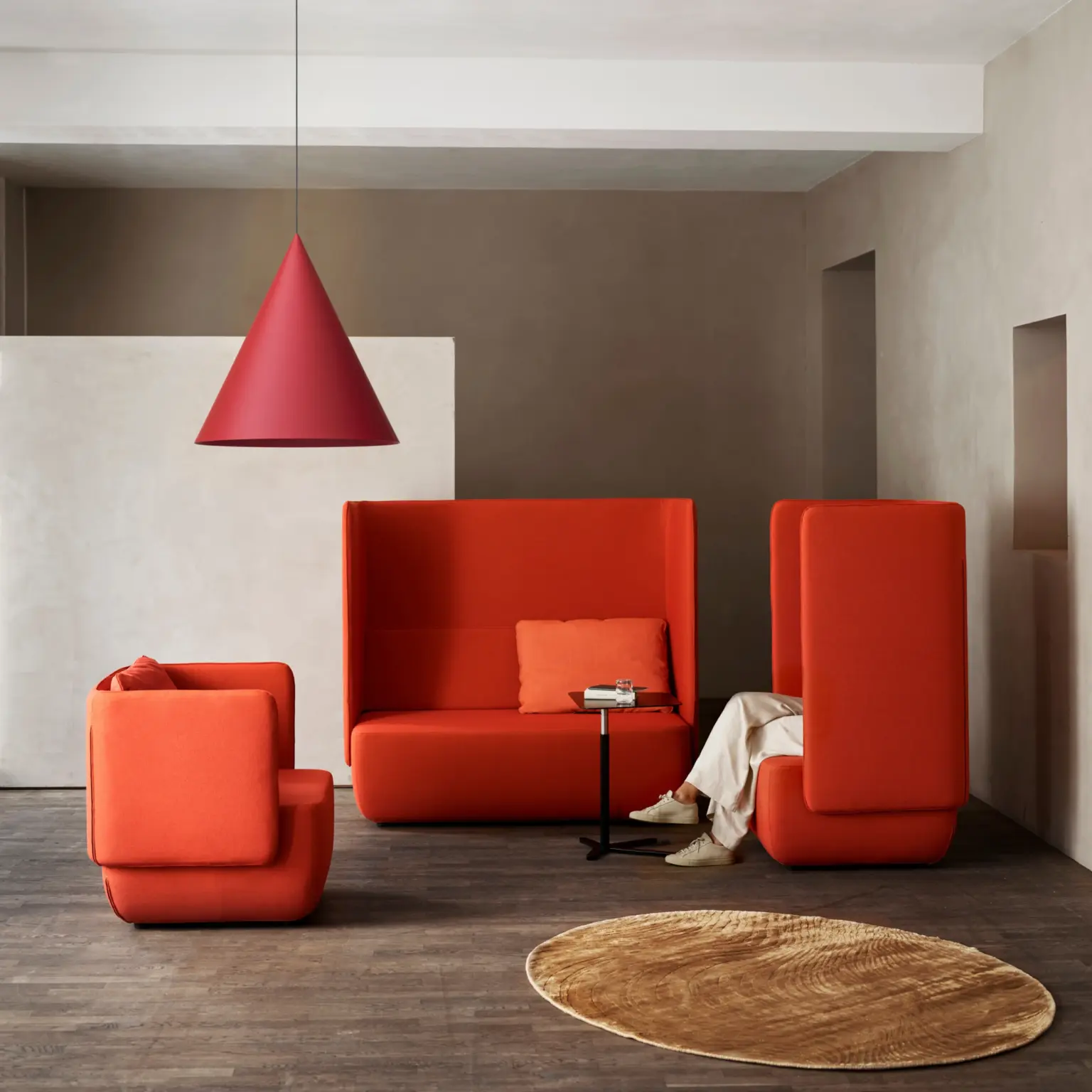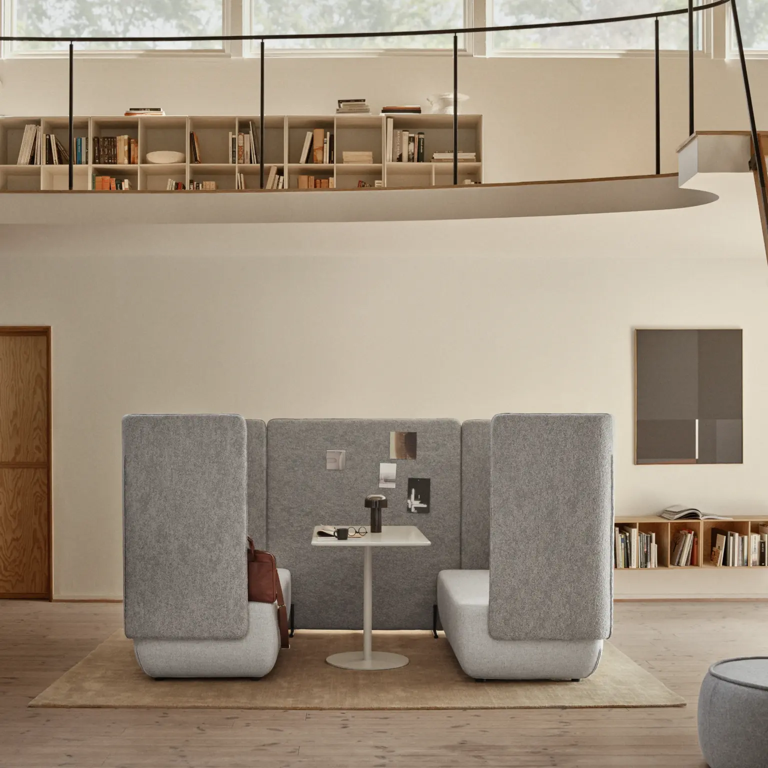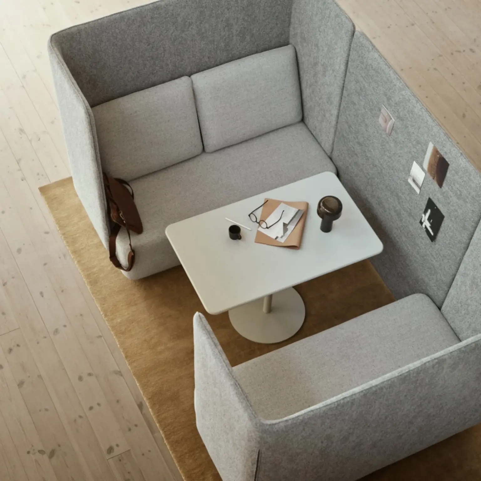 Le dossier haut crée une sensation d’enveloppement. Cette configuration favorise les discussions, les réunions rapides ou les moments de concentration dans un espace partagé.
