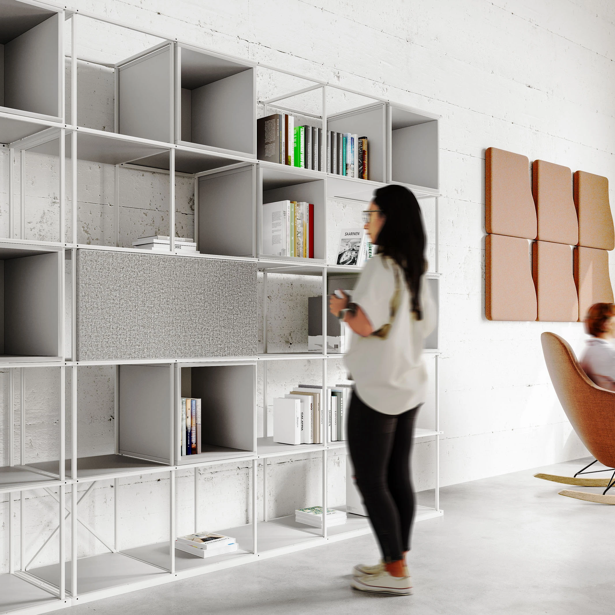 - Configurations infinies : choix libre d’étagères ouvertes, niches, caissons fermés, panneaux acoustiques ou éléments mobiles.